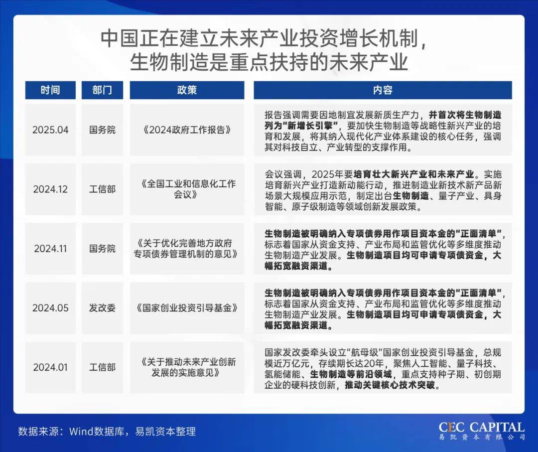 政策定位持续升级:自2021年《“十四五”生物经济发展规划》将生物制造列为战略性新兴产业以来,中央政策不断强化其战略地位。2023年中央经济工作会议首次明确将生物制造作为“若干战略性新兴产业”之一;2024年《政府工作报告》将其定位为“新增长引擎”;2025年则进一步提出“建立未来产业投入增长机制”,完成从技术研发到产业生态构建的战略纵深布局。这种递进式政策设计体现了国家对生物制造产业“基础性、引领性、战略性”的定位认知。