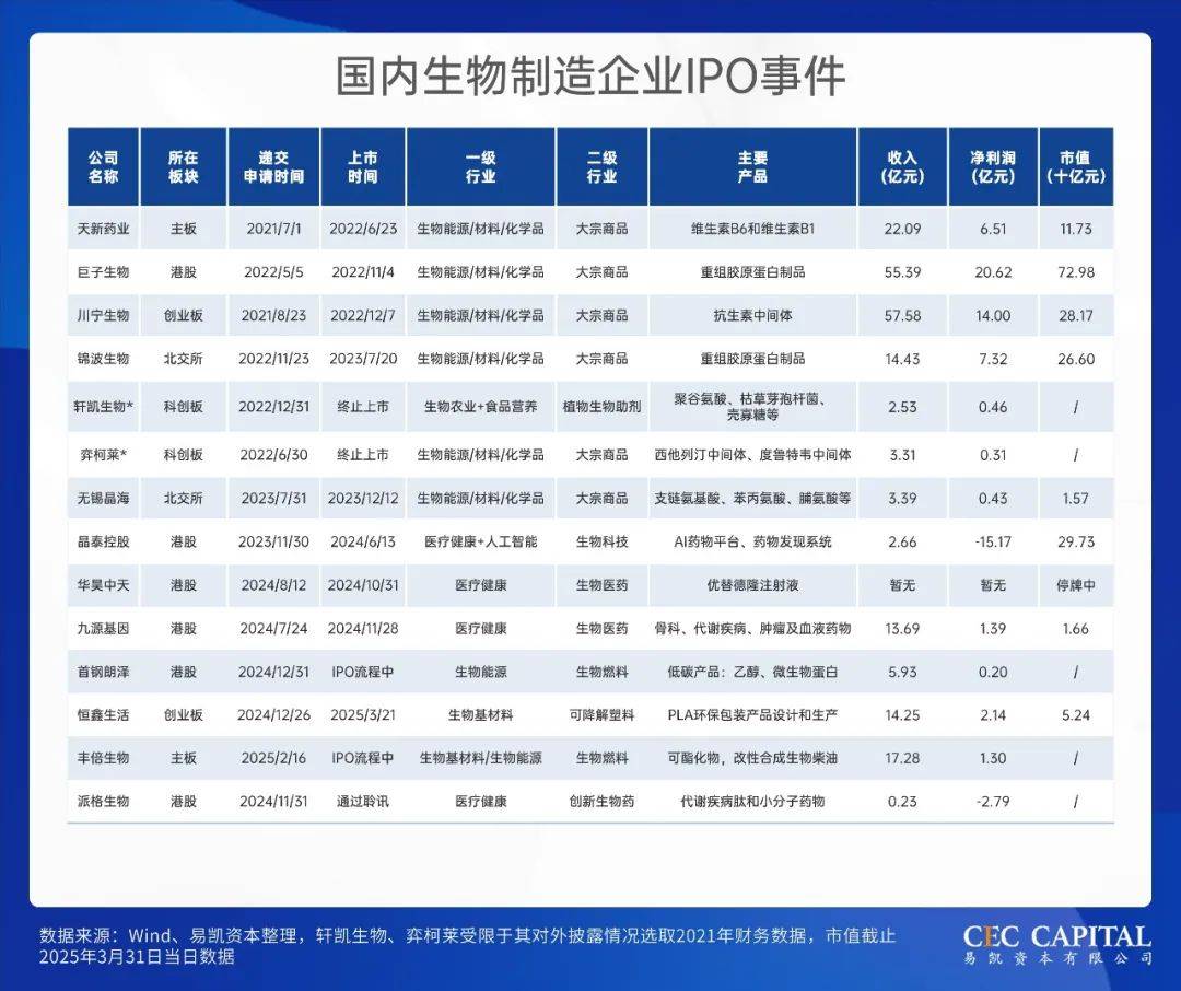 但仍然有上市受阻情况存在。例如,弈柯莱申请科创板IPO半年后主动终止,疑似因大宗产品原材料成本、出货压款、存货金额高导致现金流量净额均为负之担忧,问讯环节中,上交所主要关注弈柯莱主营业务及主要产品、科创属性、商业化模式、客户、采购与供应商、同业竞争、历史沿革、期间费用、财务性投资等17个问题,表明各家生物制造公司的基本面仍然是上市的金标准。据我们了解,弈柯莱在2024年仍然表现出良好的增长态势,其多个产品品类在市场中具备绝对的竞争优势。随着业务结构的不断优化,也逐步逼近盈亏平衡点,在未来,弈柯莱仍然会寻求上市机会。