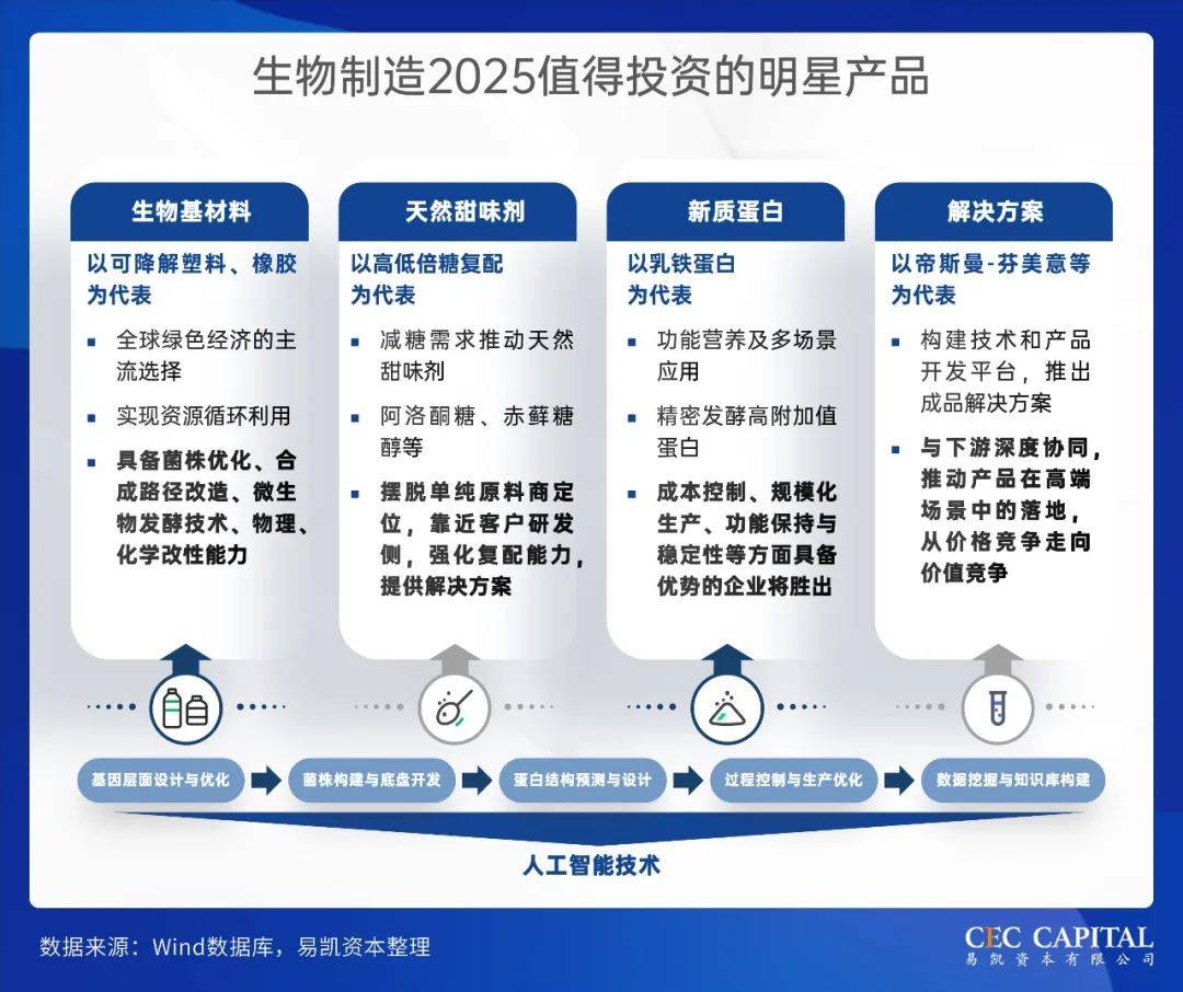 此外,除了三大底层技术之外,人工智能(AI,以下简称AI)作为贯穿整个生物制造底层技术的第四技术,其重要性在近年和未来不断凸显。生物制造作为新兴技术领域,正通过与AI技术、合成生物学、信息技术等跨学科技术的深度融合,推动产业向智能化、绿色化和高效化方向转型。其中,最受关注的便是AI技术在生物制造产业中的融合应用,科学家们、企业家们正通过AI与生物技术的深度协同创造新的可能性。例如,在实验室侧,AI通过机器学习算法加速基因编辑技术的突破。CRISPR-Cas9结合AI预测工具,显著提升基因编辑的精准度与效率,优化微生物代谢路径以实现高效生产;在生产端,AI支撑生产设备,实现数据化生产工艺,为发酵、提取、纯化、加工等各个环节带来更高效率。不仅如此,合成生物技术与AI融合进行生物系统行为模拟,智能化自主设计人工基因线路,大幅降低实验试错成本。例如,AI辅助的代谢工程已应用于开发高产菌株,使L-丙氨酸等化学品的生产成本降低50%。易凯资本认为,AI和生物制造领域的融合已成为大势所趋。