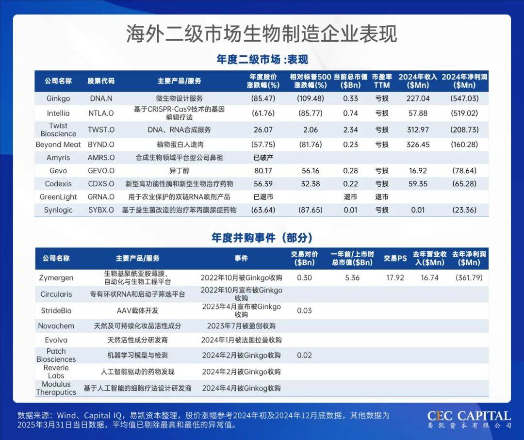 此外,虽然Ginkgo宣称自己是一个合成生物学“操作系统”,且这个操作系统由生物铸造厂(Foundry)和代码库(Codebase)两部分组成,但实际上客户高度定制化的需求导致平台化并未真正降低边际成本,工程成本居高不下,难以快速提升盈利能力。Ginkgo在2024年大幅通过收购、并购进行战略扩张,业务拓展至农业、食品等领域,但目前来看尚未能形成协同效应。截止至2025年第一季度,Ginkgo Bioworks的市值已从270亿美元的高位暴跌至3亿美元。